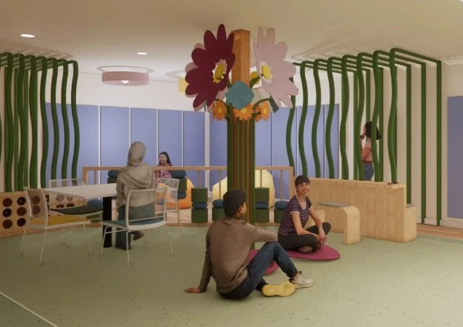 All the design choices made were rooted in research, which shows that individuals with autism often respond positively to natural and earthy tones. Inspired by California’s native flora, we curated a calming palette featuring hues drawn from forget-me-nots, honeysuckle, California poppies, wild roses, wild cosmos, bluebonnets, foxglove, and daisies. A cool-toned tan acts as a transitional shade, creating visual continuity throughout the space.
